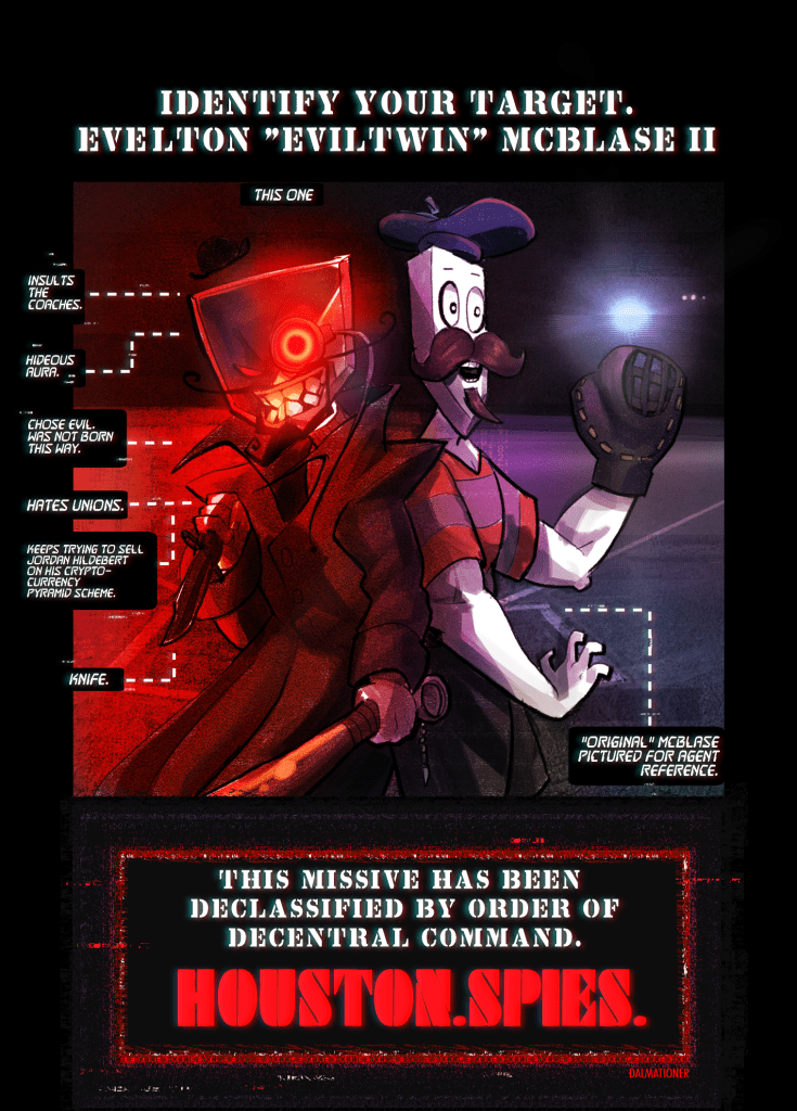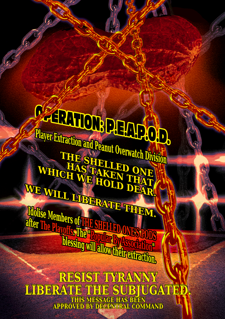 Another Blaseball poster. Through a limited palette and heavy indexing disparate photographic elements can be blended together to make something jarring and eyecatching against Discord’s grey (or white!) background.