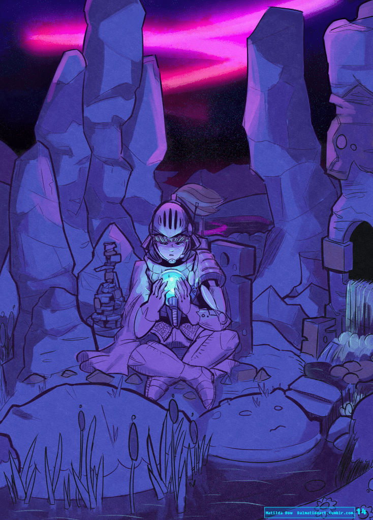 A short comic made for a friend’s zine with the prompt “Lady Knight.” This one is heavily inspired by the game Hyper Light Drifter.
