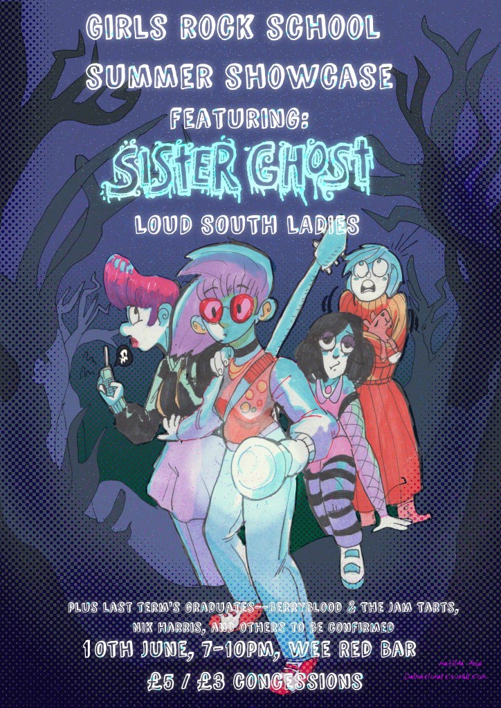 Here is a poster I did for the Riot Grrl band Fistymuffs as a gift. It is done through a combination of collage, photocopying and alcohol-based felt tip ink to fit the DIY style. This piece also marks my early forays into a sort of ‘exaggerated retro’ style. Materials: Photocopied newspaper, Windsor & Newton Promarkers, Fineliner.